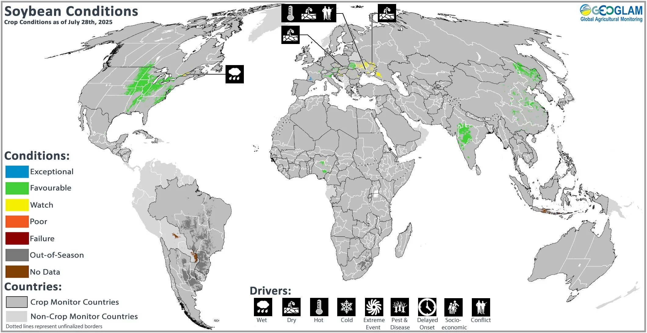 Soybean crop conditions over the main growing areas are based upon a combination of national and regional crop analyst inputs, along with earth observation data. Conditions are based upon information as of July 28th.
