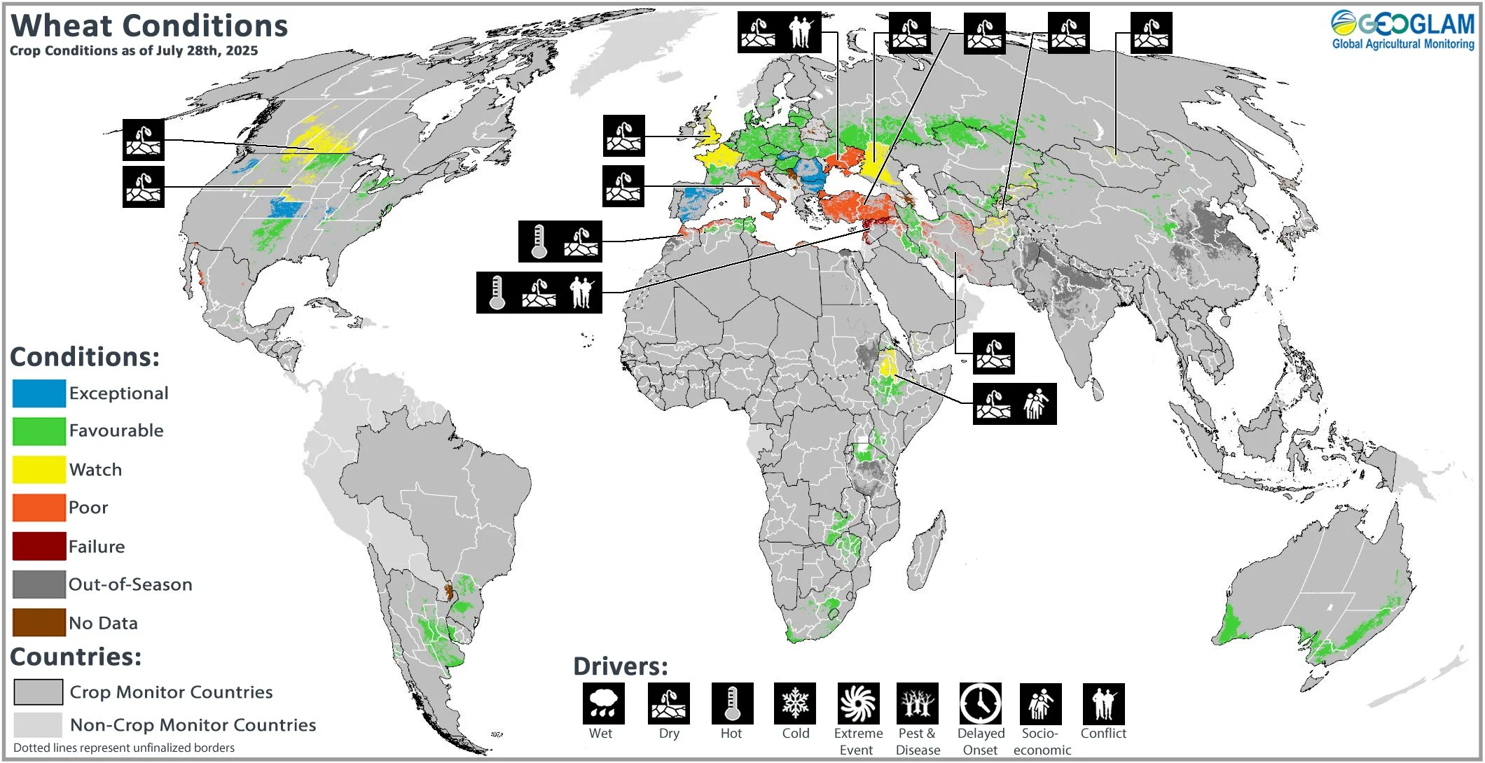 Wheat crop conditions over the main growing areas are based upon a combination of national and regional crop analyst inputs, along with earth observation data. Conditions are based upon information as of July 28th.