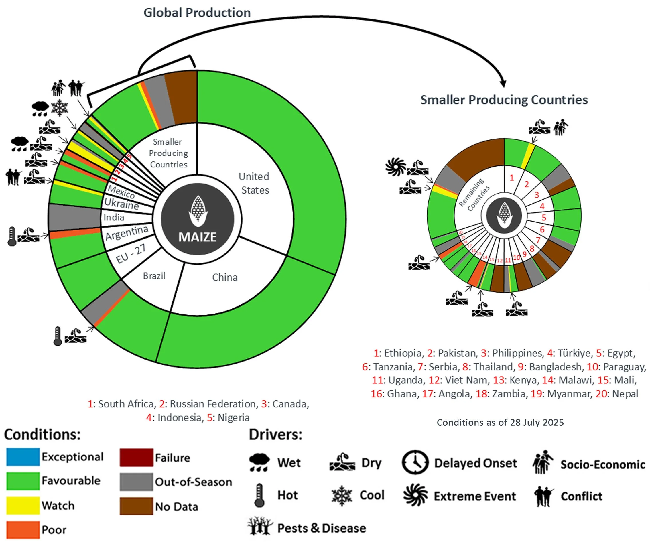 Pie Chart Description: Each slice represents a country's share of total Global production (5-year average). Main producing countries (representing 90-95 percent of production) are shown individually, with the remaining 5-10 percent grouped into the “Smaller Producing Countries” category. The proportion within each national slice is coloured according to the crop conditions within a specific growing area; grey indicates that the respective area is out of season. Sections within each slide are weighted by the sub-national production statistics (5-year average) of the respective country. The section within each national slice also accounts for multiple cropping seasons (e.g., spring and winter wheat). When conditions are other than ‘favourable’, icons are added that provide information on the key climatic drivers affecting conditions.