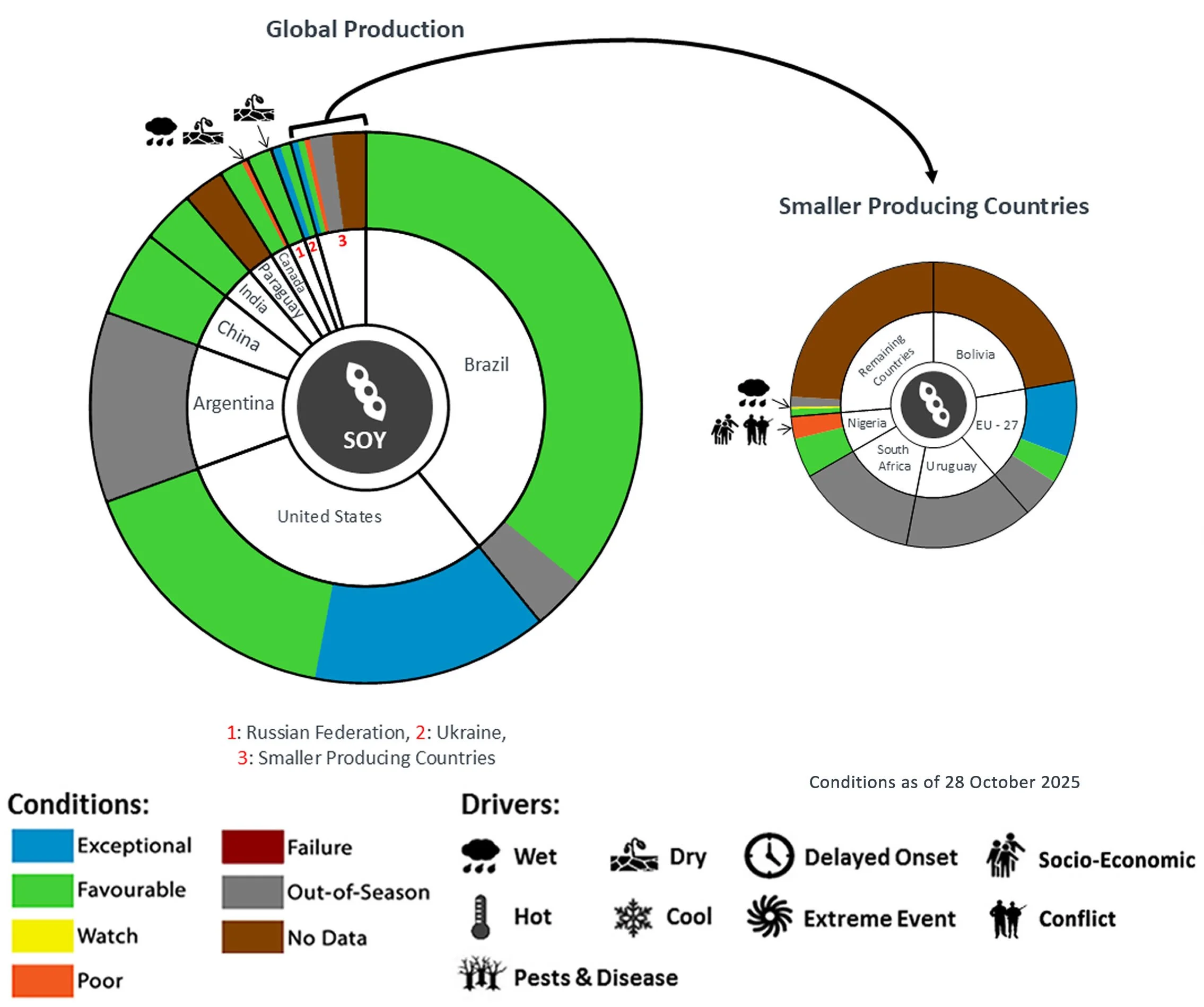 Pie Chart Description: Each slice represents a country's share of total Global production (5-year average). Main producing countries (representing 90-95 percent of production) are shown individually, with the remaining 5-10 percent grouped into the “Smaller Producing Countries” category. The proportion within each national slice is coloured according to the crop conditions within a specific growing area; grey indicates that the respective area is out of season. Sections within each slide are weighted by the sub-national production statistics (5-year average) of the respective country. The section within each national slice also accounts for multiple cropping seasons (e.g., spring and winter wheat). When conditions are other than ‘favourable’, icons are added that provide information on the key climatic drivers affecting conditions.