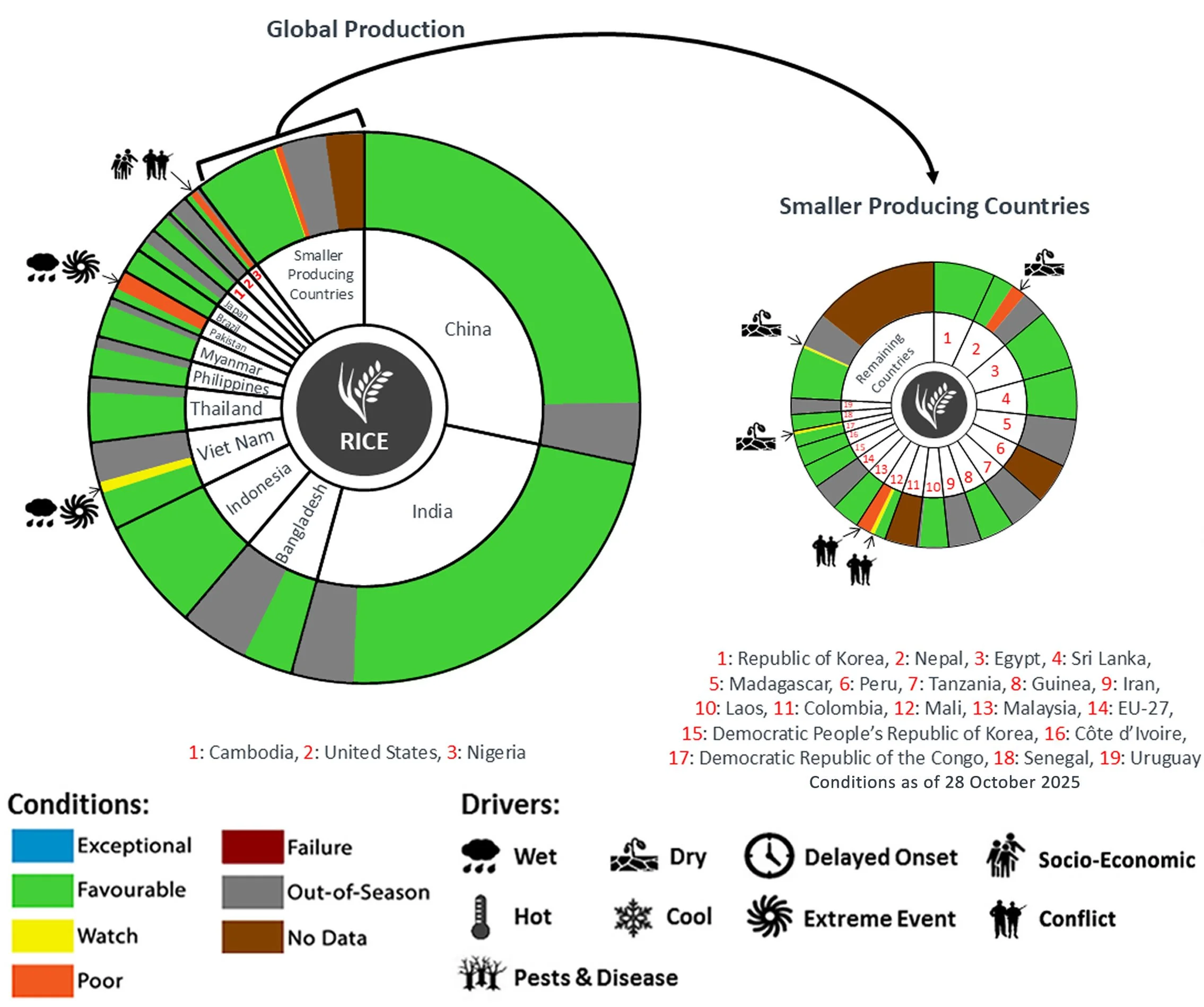 In East Asia, the harvest in China of single-season rice (largest season) and the late double-crop (medium season) progresses. In Japan, harvesting is wrapping up under favourable conditions. In the Republic of Korea, the harvest is finishing under favourable conditions. In the Democratic People’s Republic of Korea, harvesting is finalizing under favourable conditions. In Central & South Asia, conditions are favourable in India for Kharif rice (larger season) as harvesting progresses in the northern part of the country. In Bangladesh, early harvesting of the Aman crop (medium season) is beginning. In Sri Lanka, harvesting of the Yala season crop (smallest season) is wrapped up under favourable conditions. Sowing of the Maha season crop (largest season) is beginning. In Nepal, the main season rice is under mostly favourable conditions. In Southeast Asia, harvesting of dry-season rice in Indonesia advances as the sowing of wet-season rice begins with the start of rainfall in early October. In Malaysia, harvesting of dry-season rice wraps up as the sowing of wet-season rice continues. In Brunei, the harvest of dry-season rice continues as sowing begins for wet-season rice. In Viet Nam, tropical storms in late September caused damage to summer-autumn rice (wet-season) in the north. In the south, the harvest of the summer-autumn rice (wet-season) is wrapping up as the harvest of autumn-winter rice and seasonal rice (wet-season) begins. In Thailand, wet-season rice is under generally favourable conditions despite some recent flood damage from several tropical storms (Bualoi & Matmo). In the Philippines, conditions are favourable for wet-season rice, albeit with some losses from the combined effects of the southwest monsoon and five tropical cyclones. In Myanmar, wet-season rice is under favourable conditions. In Cambodia, harvesting of wet-season rice has begun. In the Americas, harvesting is finishing in the US. Eastern Cuba and Haiti have been impacted by excessive rainfall from the passing of Tropical Storm Melissa in late October. In Brazil, sowing is picking up pace with an expected decrease in total sown area compared to last year. In MENA, harvesting in Egypt of the summer-planted rice is wrapping up as the Nili season (Nile flood) rice crop develops. In Sub-Saharan Africa, conditions are favourable except for continuing areas of conflict in Mali and northern and northeastern Nigeria. In the DRC, dry conditions remain in the west.