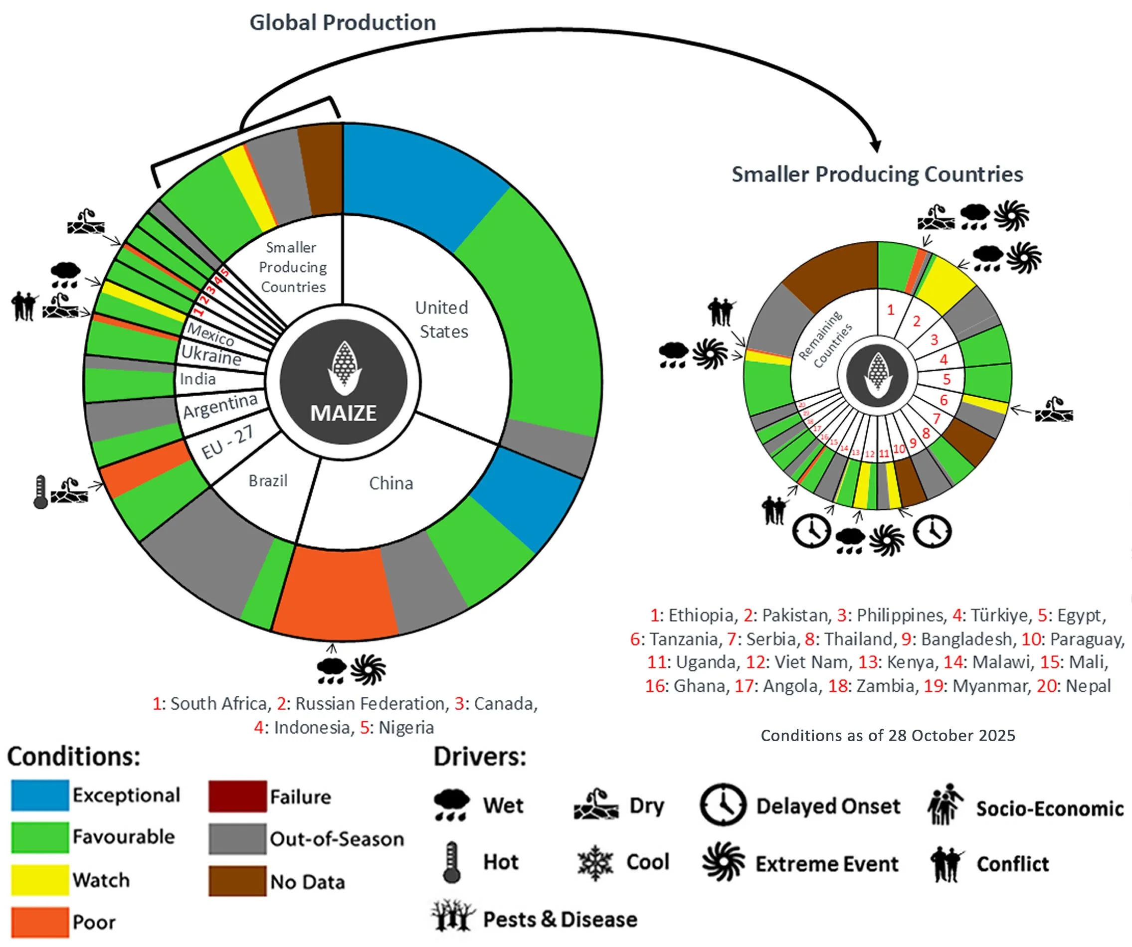 Maize crop conditions over the main growing areas are based upon a combination of national and regional crop analyst inputs, along with earth observation data. Conditions are based upon information as of October 28th.