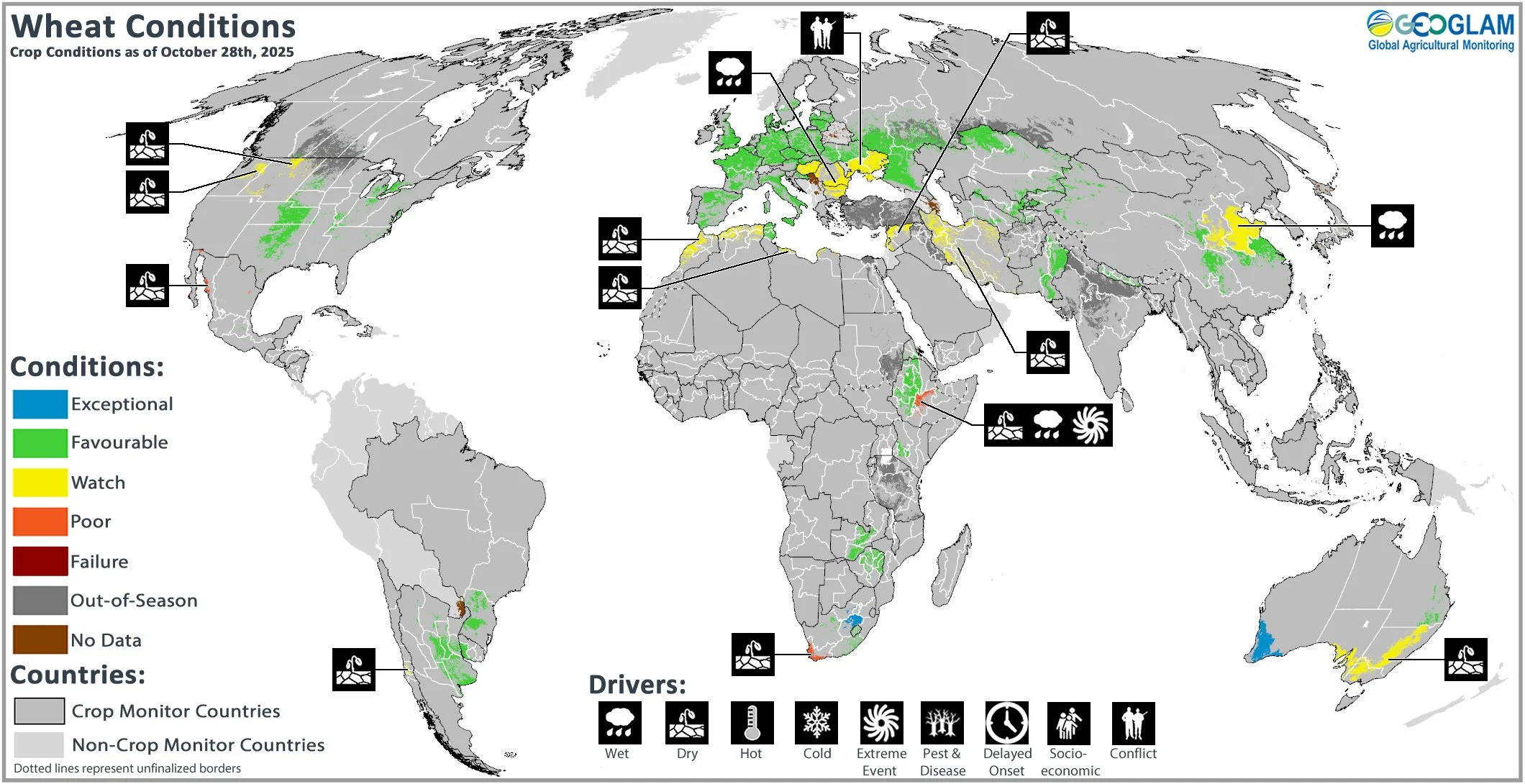 Wheat crop conditions over the main growing areas are based upon a combination of national and regional crop analyst inputs, along with earth observation data. Conditions are based upon information as of October 28th.