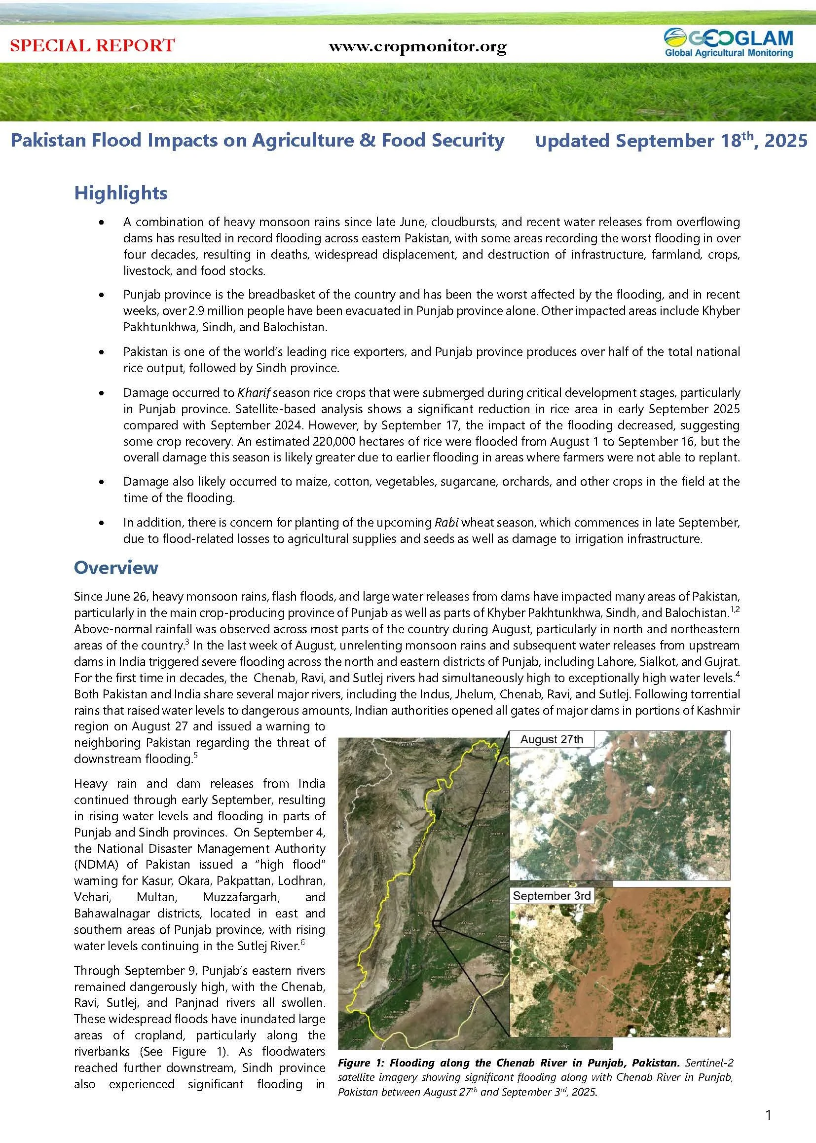 Since June 26, heavy monsoon rains, flash floods, and large water releases from dams have impacted many areas of Pakistan, particularly in the main crop-producing province of Punjab as well as parts of Khyber Pakhtunkhwa, Sindh, and Balochistan [1,2]. Above-normal rainfall was observed across most parts of the country during August, particularly in north and northeastern areas of the country [3]. In the last week of August, unrelenting monsoon rains and subsequent water releases from upstream dams in India triggered severe flooding across the north and eastern districts of Punjab, including Lahore, Sialkot, and Gujrat. For the first time in decades, the Chenab, Ravi, and Sutlej rivers had simultaneously high to exceptionally high water levels [4]. Both Pakistan and India share several major rivers, including the Indus, Jhelum, Chenab, Ravi, and Sutlej. Following torrential rains that raised water levels to dangerous amounts, Indian authorities opened all gates of major dams in portions of Kashmir region on August 27 and issued a warning to neighboring Pakistan regarding the threat of downstream flooding [5].