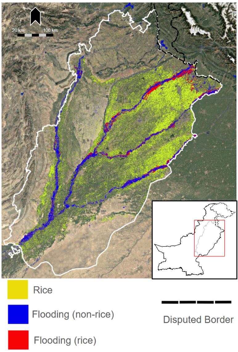 Figure 2: Rice flooded area extent in Punjab, Pakistan from August 1st to September 16th. NASA Harvest rice area (yellow) using Sentinel 2 and the Harmonized Landsat Sentinel datasets (S. Baber, A., Qadir). The max flooded area extent was mapped using a combination of NASA LANCE NRT 2-day flood composite and Microsoft AI for Good flood model from August 1st to September 16th. Flooding over rice areas is shown in red while flooding over non-rice areas is shown in blue.